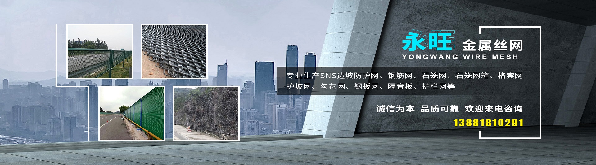 服務(wù)熱線: 成都市永旺金屬絲網(wǎng)有限公司是一家研發(fā)、生產(chǎn)、加工、銷售為一體的責(zé)任制企業(yè)公司。本公司“以誠(chéng)信為本、以服務(wù)社會(huì)已任、以科學(xué)創(chuàng)新為理念”。 專業(yè)生產(chǎn)SNS邊坡防護(hù)網(wǎng)、鋼筋網(wǎng)、石籠網(wǎng)、石籠網(wǎng)箱、格賓網(wǎng)、護(hù)坡網(wǎng)、勾花網(wǎng)、鋼板網(wǎng)、隔音板、護(hù)欄網(wǎng)等。產(chǎn)品主要運(yùn)用于鐵路,高速公路,橋梁,隧道,機(jī)場(chǎng),礦山,河道,球場(chǎng),碼頭,港口等多個(gè)領(lǐng)域。 本公司期待與您長(zhǎng)期合作,希望與您共創(chuàng)輝煌,我們?cè)概c各業(yè)朋友精誠(chéng)合作,共創(chuàng)美好未來(lái),希望各業(yè)朋友來(lái)函來(lái)電